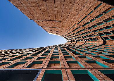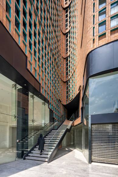 نمای برج، تلفیقی از آجر ایرانی مدرن و متریال شیشهای است که در کنار فرم پویای بدنه، یک اثر هنری شهری خلق کرده است.